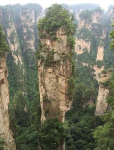 8日早上,我們乘坐“世界第一梯”——百龍天梯至袁家界峰頂,這里是舉世聞名,奇特罕見的砂巖地貌。舉目遠望,三千奇峰盡收眼底,怪石嶙峋,星羅棋布,雄險秀野,神態各異。峽谷深處,千百根石峰石柱奇偉突立。峻峭之石,如英武將帥;嵯峨之峰,似勇猛壯士。天氣陰沉,下起小雨,此時,峰谷內云翻霧涌,數座山峰如中流砥柱巋然屹立于云霧之中,云海淼淼,如入蓬萊仙境,那里面一定住著神仙吧。