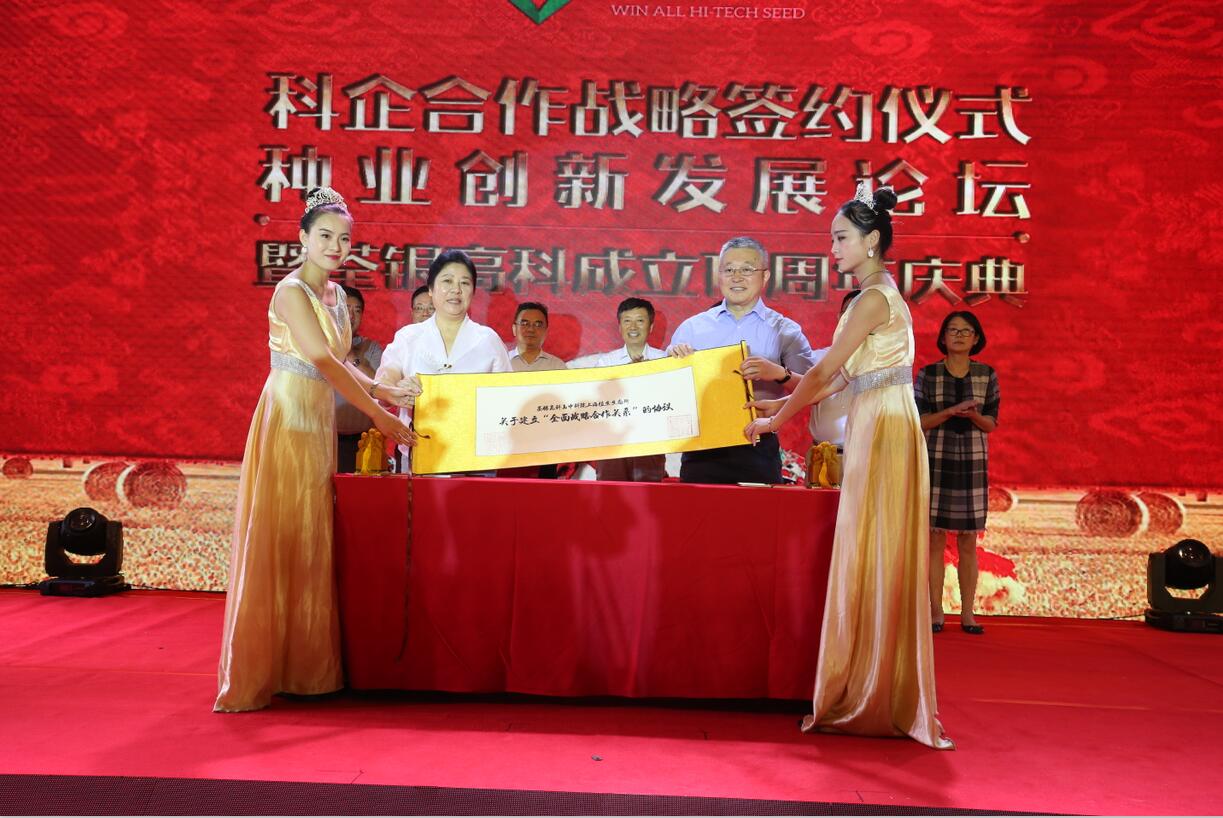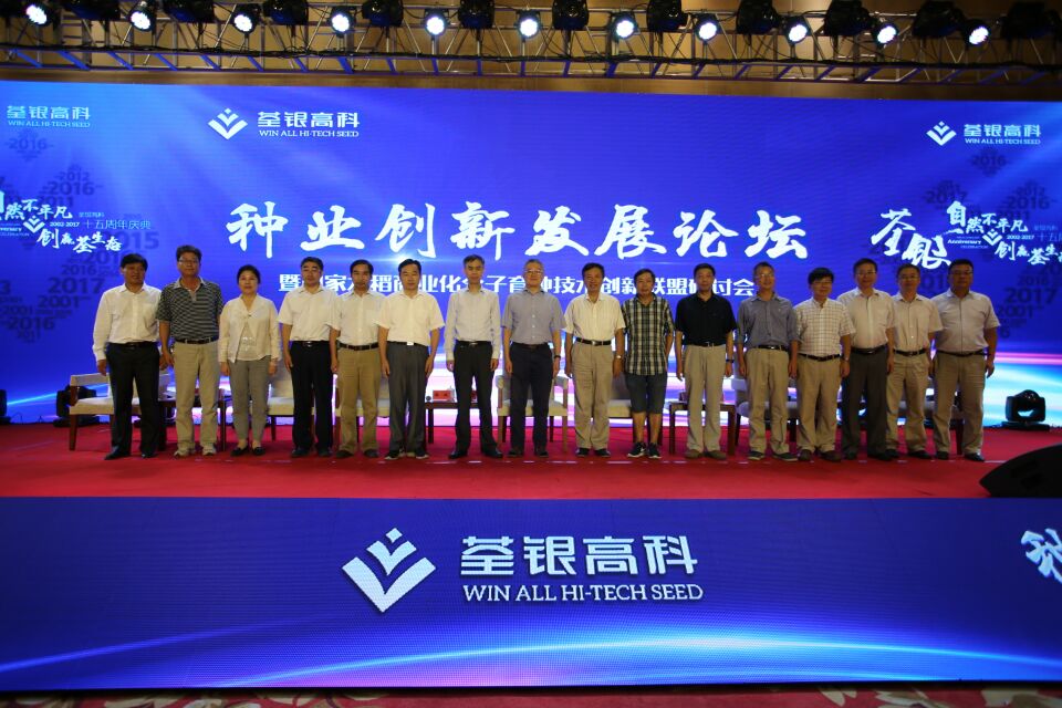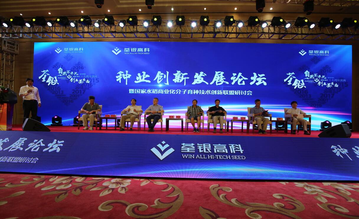 十五載風(fēng)雨兼程,十五載春華秋實!2017年8月29日,科企合作戰(zhàn)略簽約儀式·種業(yè)創(chuàng)新發(fā)展論壇暨荃銀高科成立15周年慶典大會在合肥隆重舉行。農(nóng)業(yè)部種子局局長張延秋,農(nóng)業(yè)部科教司司長廖西元,中國科學(xué)院院士、國家基因研究中心主任、上海植生生態(tài)所所長韓斌,中國種子協(xié)會副會長兼秘書長蔣協(xié)新,安徽省科技廳廳長宛曉春,安徽省農(nóng)業(yè)委員會副主任周世其、朱永東,“中國種業(yè)十大功勛人物”、荃銀高科創(chuàng)始人、安徽張海銀基金會理事長張海銀先生,以及來自農(nóng)業(yè)部、中國種子協(xié)會和省、市有關(guān)部門的領(lǐng)導(dǎo)、專家、嘉賓,國家水稻商業(yè)化分子育種技術(shù)創(chuàng)新聯(lián)盟的科學(xué)家,戰(zhàn)略合作簽協(xié)單位代表,種業(yè)界同仁,還有來自印度尼西亞、孟加拉、巴基斯坦、越南等國家的20多位外賓朋友,計500多人參加了此次活動。