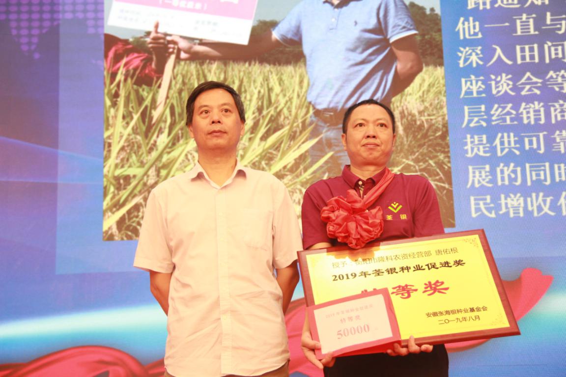?? ?隨后,張海銀種業基金會鄭滿生監事宣讀了張海銀種業基金會“荃銀種業促進獎”2019年頒獎決定文件。大會向38名在優質水稻推廣和良種服務等方面取得優異成績的個人頒發了“荃銀種業促進獎”專項獎。